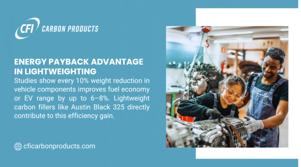 | Weight Reduction | Excellent; low specific gravity options (e.g., Austin Black 325) permit high volume at low mass. | Poor; high-mass inorganic materials add significant weight to the final product. | Carbon black density is superior for weight control. |